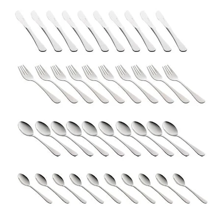 Stort bestiksæt fra serien Atelier fra Aida. Stilrent blankt “finish” og er lavet af højkvalitets 18/10 rustfri stål. Består af 10x knive, 10x gafler, 10x skeer, samt 10x teskeer.