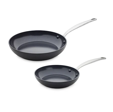 Sæt med to stykker stegepander fra GreenPan, den ene måler Ø 28 cm og den anden måler Ø 24 cm.