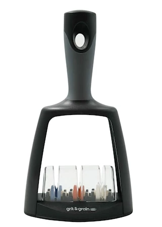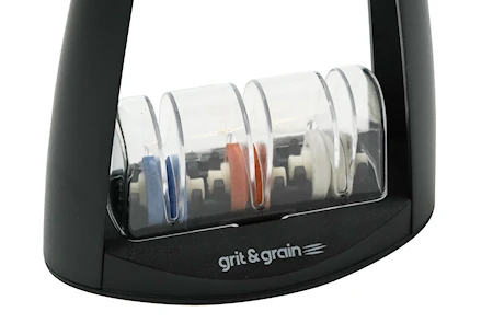 Knivsliber med tre forskellige vådslibere fra Grit & Grain. Med dette smarte produkt kan du på en utrolig enkel måde slibe dine knive ved hjælp af slibesten. De forskellige slibeniveauer er 360, 600 og 800 grit.
