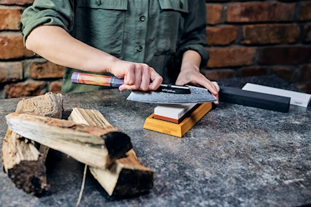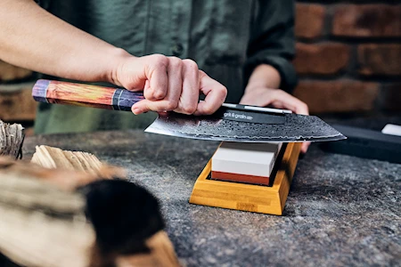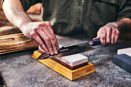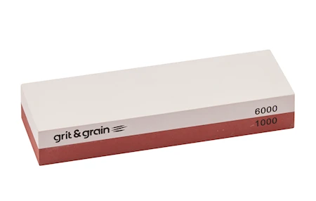 Vådslibesten har en lang historie og bruges til at slibe knive til ekstrem skarphed. Forskellige sten har forskellige kornværdier. En lav kornværdi giver en grovere slibning, mens en høj kornværdi giver en flot polering og endelig finish Denne sten fra Grit & Grain har to sider med forskellige kornværdier. Begge værdier tælles som meget lave, hvilket betyder, at der slibes relativt meget stål væk fra kniven. Den er således fremragende at bruge til at slibe hak og uregelmæssigheder på en beskadiget knivkant. Det giver også en grundlæggende skarphed til meget kedelige knive. For at give din kniv ekstra skarphed er det absolut nødvendigt, at der bruges en sten med højere grusværdier bagefter; for eksempel kombinationsstenen fra Grit & Grain. Den har kornværdier på 1000 og 6000 og giver god skarphed. En kniv, der allerede har en glat kant og relativt god grundlæggende skarphed, skal slibes direkte på kombinationsstenen med kornværdi 1000 og 6000. Vådstenen skal gennemblødes i ca. 10 minutter inden hver brug. Der er mange forskellige teknikker til slibning på vådsten. Det vigtigste er, at knivens vinkel mod stenen holdes konstant under slibning. Den mest almindelige slibevinkel er 15-20 grader. En nem måde at finde den rigtige vinkel på er at indstille kniven til 90 grader i forhold til stenen (ligesom en kniv normalt holdes), så vippe den i halv vinkel (du har nu en 45 graders vinkel) og derefter vippe den lidt mere end halvdelen igen. Du skal derefter have en vinkel på stenen på ca. 15-20 grader. Japanske kokkeknive har normalt en lavere slibningsvinkel (12-15 grader), mens europæiske kokkeknive har en lidt højere slibningsvinkel (20-25 grader). En anden metode er at købe Grit & Grains slibestøtter. Det er en lille klemme, der sættes på toppen af ??bladet. Slibestøtten skal være mod stenen, når du slibes. På denne måde får du en lige vinkel på begge sider af kniven under hele slibningen. Lad kniven løbe over hele stenens overflade i lange bevægelser, og sørg for, at begge sider af kanten er formalet omtrent ens. For at forhindre stenen i at glide på bænken, når den slibes, anbefales det at placere den på et vådt viskestykke. Produktmål: 21,8 x 9,5 x 5,3 cm