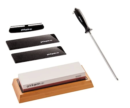 Den ene side på Grit & Grains kombinationssten har en værdi på 1000, hvilket er perfekt til at slibe en god grundskarphed frem. Den anden side har en værdi på 6000 og bruges efterfølgende til at give æggen en knivskarp finish.