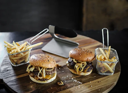 En smasher er et must til hamburgerelskeren. Men denne smasher fra svenske Nordwik er ikke kun velegnet til at anvende til hamburgerkød, den passer også perfekt til alt du steger eller griller, som du vil presse og lægge tryk på. Smasheren er lavet af 6 mm tykt stål, er lavet af malm fra Kiruna, hvilket giver den en naturlig og jævn tyngde. Den er også udstyret med et varmeisoleret håndtag i gummi, så du kan holde i det uden grydelapper.