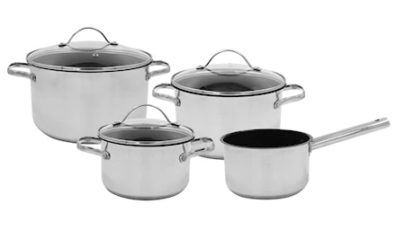 Et komplet grydesæt med en keramisk non-stick belægning i et stilrent design og rustfrit stål.