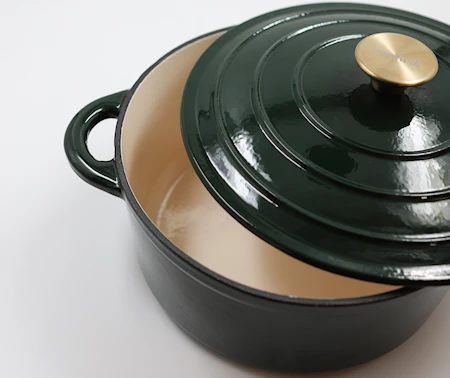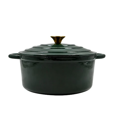 Det tykke støbejern holder på og fordeler varmen jævnt og stabilt. Den hårde emalje fungerer som en barriere mod jernet og gør gryden modstandsdygtig over for rust. Disse egenskaber gør gryden til et oplagt valg til mange forskellige retter. En trofast arbejdskammerat, der står klar til at hjælpe dig med at levere lækre gryderetter og supper i mange år fremover.