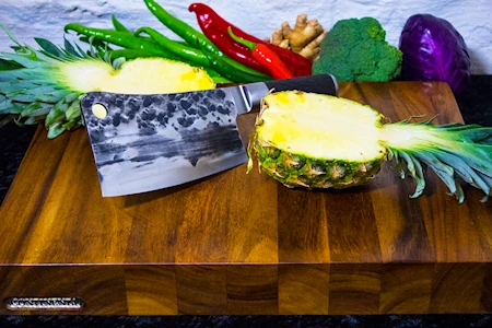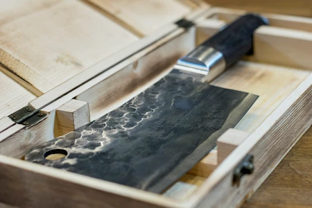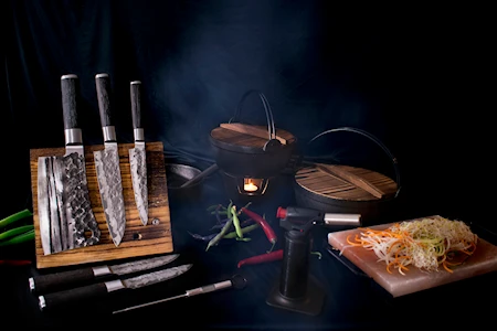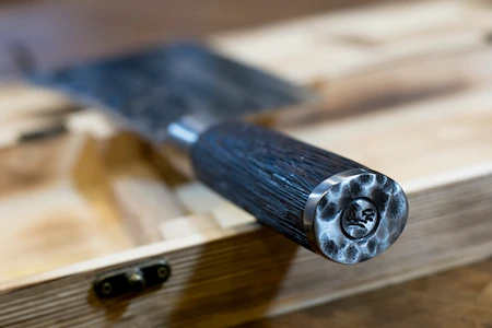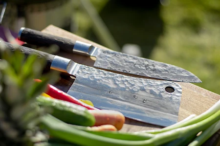 Satake Kuro er en rustik kniv med et grovhamret knivblad som er forarbejdet otte gange. Hvilket giver den ekstra høj skarphed og en hårhed på omkring 58 HRC. Langt håndtag palisandertræ og skaft af rustfri stål.